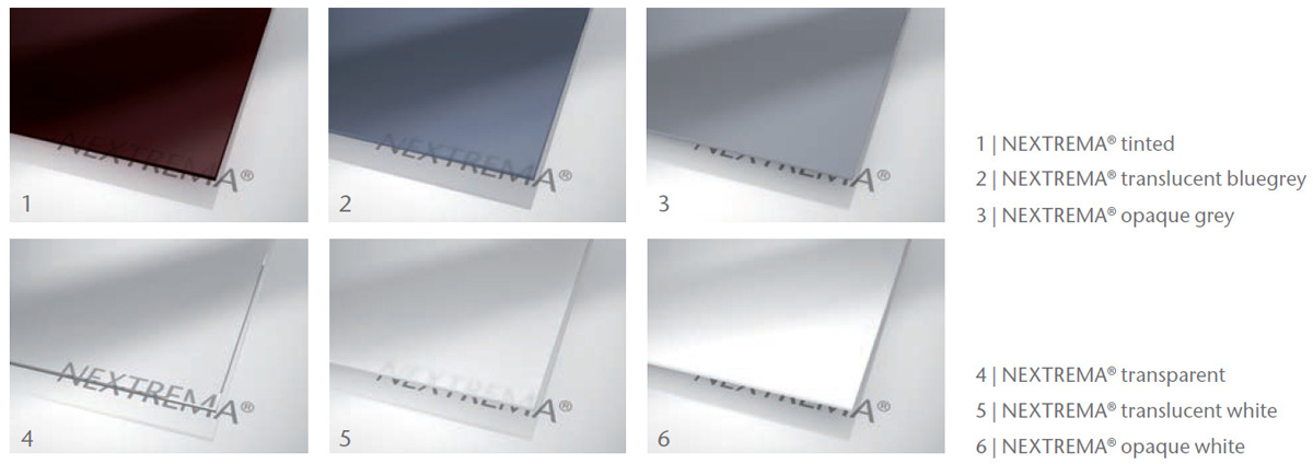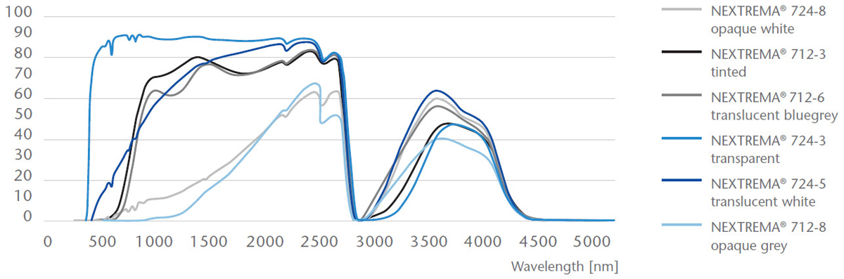 NEXTREMA® is a unique family of glass-ceramics. This material combines the glossy appearance of glass with exceptional thermal, chemical, optical and mechanical properties like an attractive bending strength of 100 – 160 MPa for materials with a thickness of around 4 mm. With a thermal resistance of 950 °C or for specific applications even higher, combined with a thermal shock resistance of 700 – 820 °C, it ensures a reliable material performance even under extreme temperature conditions. Our six unique glass-ceramic types combined with the wide range of sizes and thicknesses varying from 2 mm to 6 mm (> 6 mm on request) will open up new possibilities in product design and performance. The unique transmission spectra provide new ideas for combining innovative infrared heating functionalities with attractive lighting effects. The versatility of this material will surely impress you.
